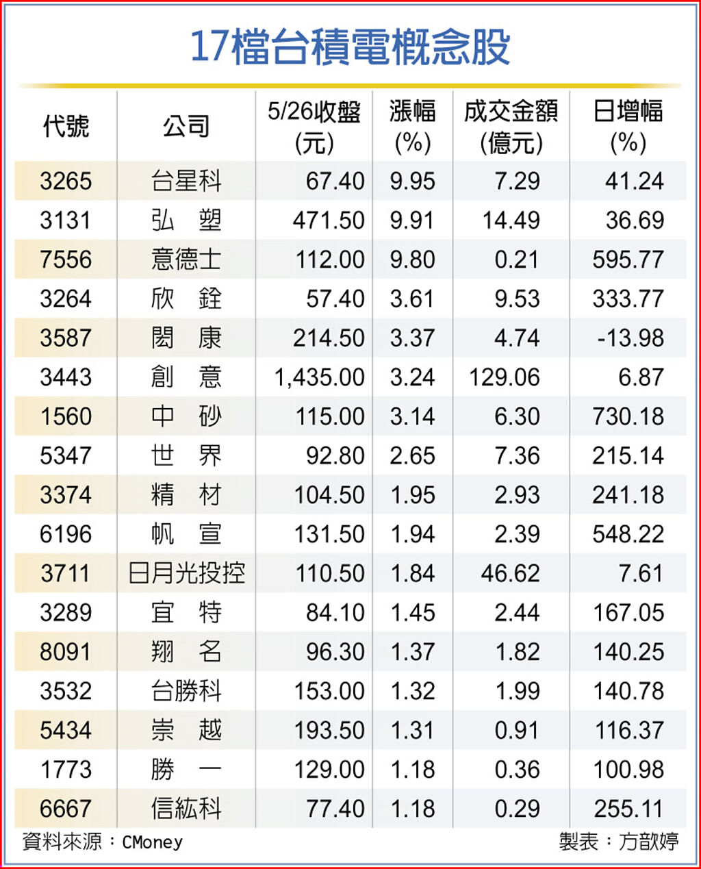 另有包括台星科、弘塑、意德士、欣銓、閎康、創意、中砂、世界、精材、帆宣、日月光投控、宜特、翔名、台勝科、崇越、勝一、信紘科等17檔,台積電供應鏈或概念股全面收紅,成交量多呈現倍增。