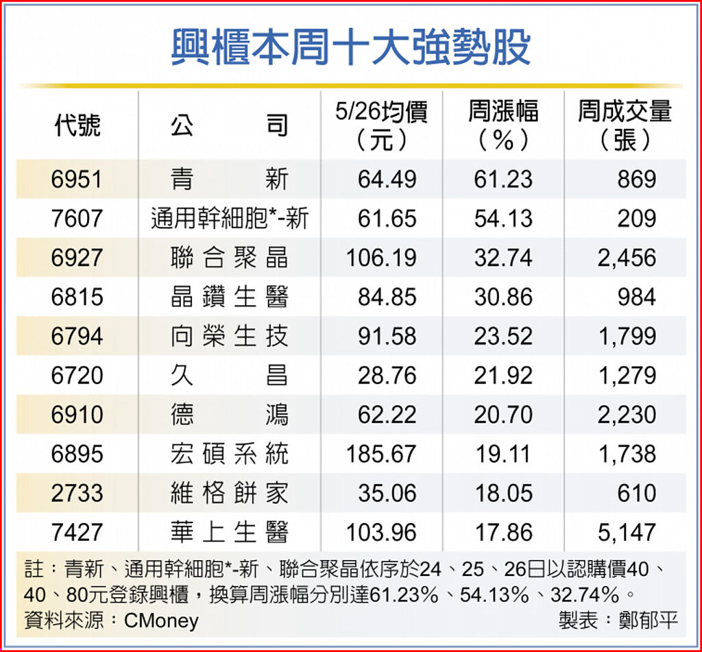 台股多頭氣焰發威,興櫃「生力軍」也大秀拳腳,青新(6951)、聯合聚晶(6927)兩檔新登錄小金雞,分別大漲61.23%、32.74%,通用幹細胞*-新(7607)也勁揚逾5成,搭上本波資金熱潮,三檔個股本周蜜月行情全數「甜滋滋」,一舉包下興櫃市場周漲幅前三名。