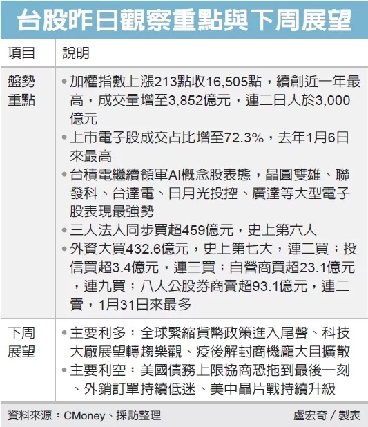 美國債限協商歹戲拖棚,所幸輝達在AI狂潮推波助瀾下,最新財測超級樂觀,那斯達克、費半指數收盤分別上漲1.7%、6.8%,台股昨日由ADR大漲12.0%的台積電領攻,連二日走揚,終場漲1.3%收16,505點,是去年6月10日來高點,成交量擴增至3,852億元,去年6月1日來最大。
