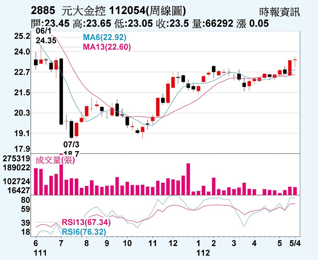 技術線型觀察,元大金目前位於周線、月線、季線上,元大金26日收在23.45元。 |