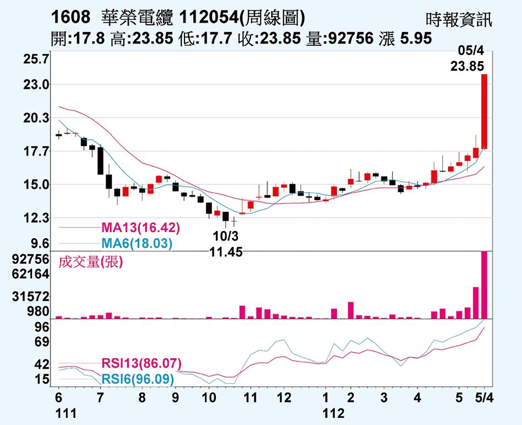 華榮(1608)不受國際銅價連續兩天跌破8,000美元影響,憑藉台電釋出饋線汰舊換新電力線纜及強韌電網計畫受益題材,市場26日追價買盤湧現,成交爆大量,開盤16分鐘,股價亮燈漲停23.85元鎖死至終場,創波段新高。