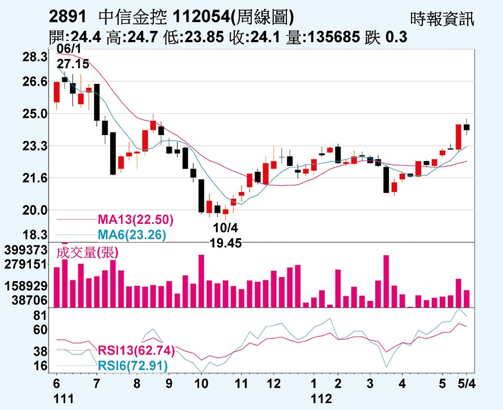 中信金股價26日收在24.1元,成交量24,686張、成交金額5.9億元。近五個交易日三大法人合計賣超10,260張,其中法人賣超12,129張、投信買超1,011張、自營商買超858張,外資主導市場走向。全周股價下跌1.23%,周線翻黑。雖然26日K線收十字線,多空互抵,不過在短線漲多下,日KD、周KD都進入高檔區,預料短期震盪機率仍高,中期月KD維持交叉向上,中多格局不變。