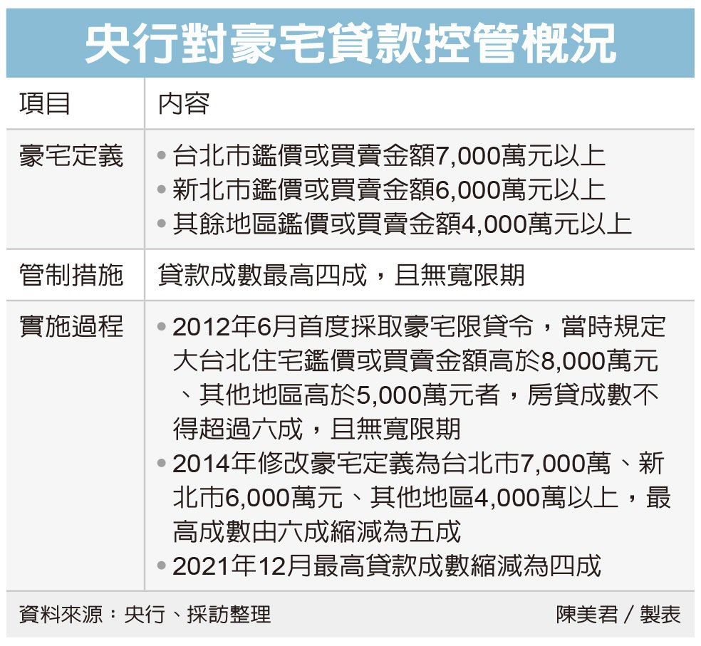 豪宅標準2012年首度問世,當時以雙北市8,000萬元、其他地區5,000萬元為標準,目的也是為了抑制房價做出豪宅限貸,在2014年調整為台北市7,000萬元、新北市6,000萬元,其他地區4,000萬元作為豪宅限貸準則,更為嚴格,且貸款成數最高四成,意即購屋族需自備六成。