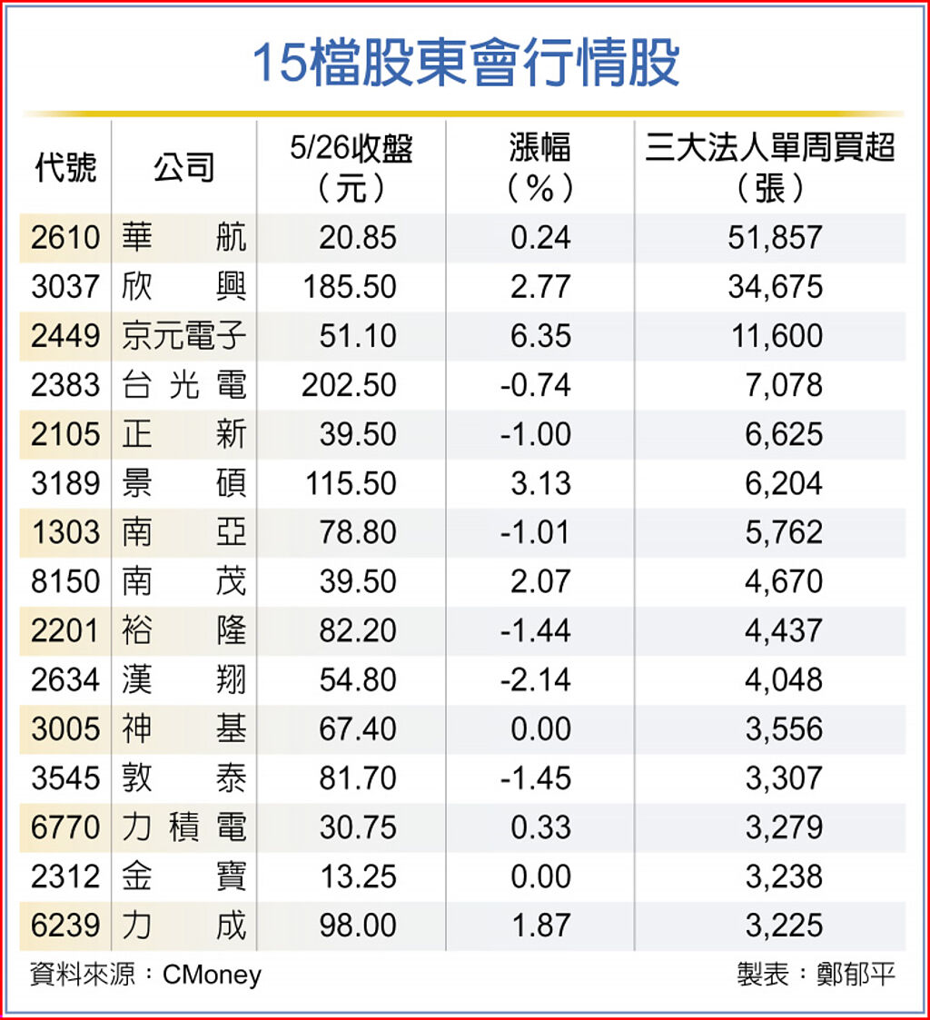 華航(2610)、欣興(3037)、京元電子(2449)等股東會前、法人上周搶先押寶股,股東會行情蓄勢待發。