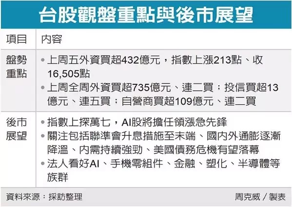 惟法人也提醒,台股短線漲多,指數已來到16,500點壓力區,行情需要人氣族群持續帶動,因此必須留意近期強漲的AI概念股股價是否能持續站穩5日線之上,是判斷多頭資金是否延續,指數再攻高機率的重要指標。