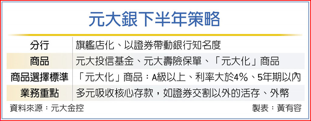 翁健指出,今年目標也要多吸收核心存款,包括非來自元大證券股市交割款的活期存款,以及外幣存款。財管方面,除了集團的壽險、基金商品之外,也推非元大發行,但屬性與元大很像的「元大化」商品;元大化產品特性包括評等A級以上、利率逾4%、5年期以內債券等有價證券。
