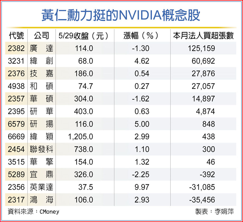AI晶片教主輝達執行長黃仁勳來台掀起旋風,他29日於演說中親點台灣合作夥伴,包括研揚科技、研華科技、安提國際(宜鼎子公司)、永擎電子(華擎子公司)、華碩、技嘉科技、鴻佰科技(鴻海子公司)、英業達、和碩、雲達科技(廣達)、泰安電腦、緯創資通和緯穎科技等,立即讓各公司如開天眼,與輝達同享AI神光。