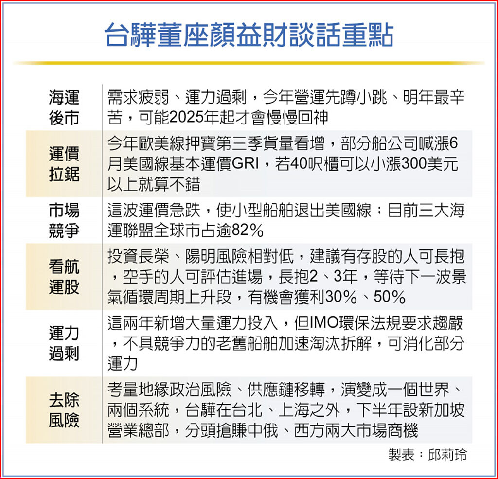 至於投資人關心的運力過剩問題,顏益財說,IMO環保法規要求日趨嚴格,不具競爭力的老舊船舶將加速淘汰拆解,可消化部分運力。