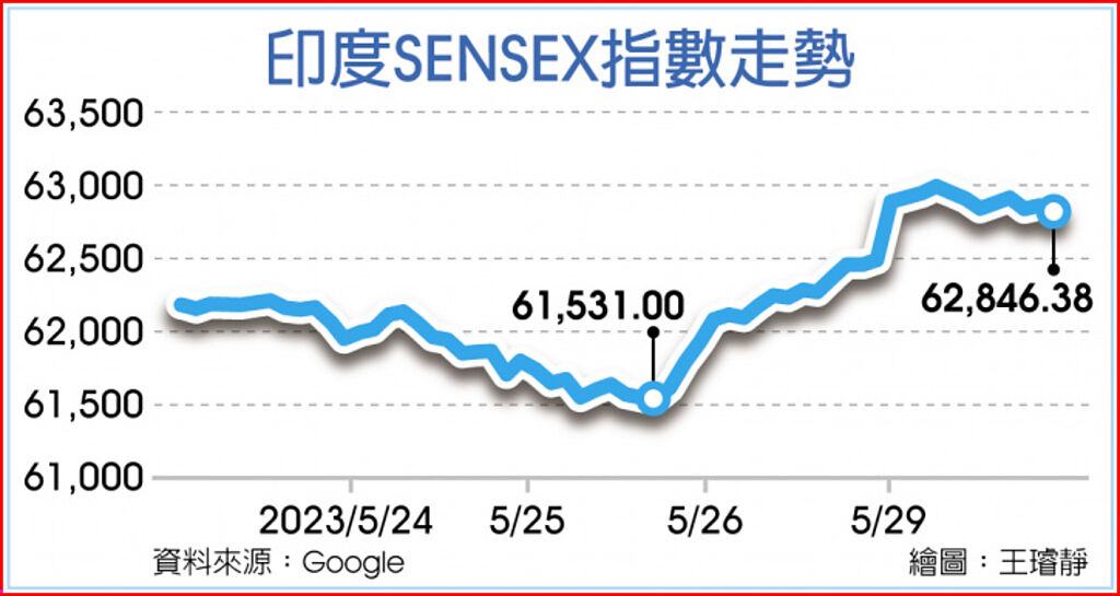 美國債限協商周末達成初步協議,全球市場瀰漫正面氣氛,印度股市29日在金融股領漲下走揚。藍籌股Nifty 50指數上漲0.63%,來到18,616點;S&P BSE Sensex指數漲0.7%,來到62,939.10點。29日印股13大類股中有10類皆漲,權重高的金融股漲幅超過1%。 |