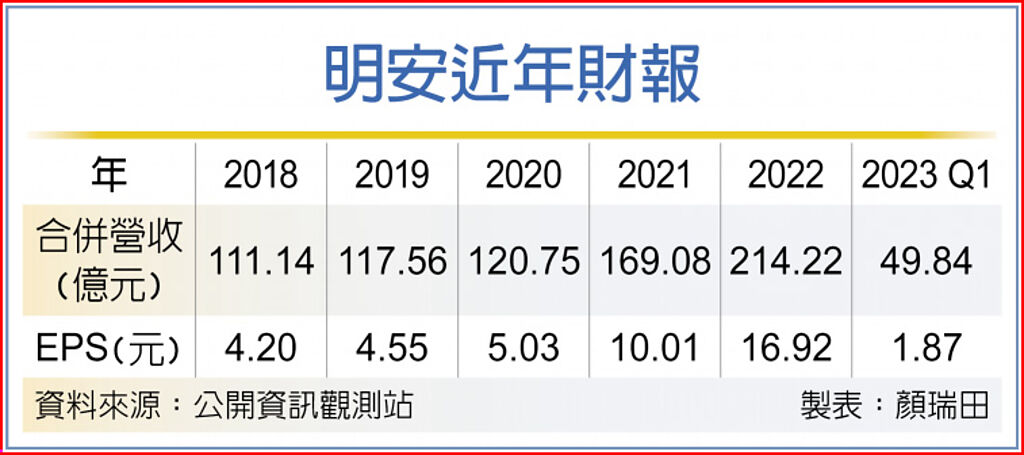 明安29日召開股東會,去年合併營收214.22億元、EPS達16.92元,均創新高,配發現金股息8.94元已於5月4日發放,股東會同時通過董事會提案,提撥盈餘的4.5%,共1.28億元作為員工酬勞。