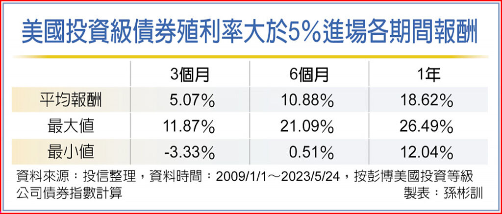 5月美債上限疑慮,使美國10年期公債殖利率由3.2%,攀升至3.8%之上,公債殖利率上揚也推升美國投資級債券殖利率彈升至5%以上。第一金美國100大企業債券基金經理人李艾倫指出,相對於公債,近期美國頂級企業債更具強勁投資需求,美國投資級債券殖利率雖跟隨公債殖利率上揚,但統計美投資級債券殖利率大於5%,即是進場布局較佳時機,持有3個月、6個月、1年等短、中、長期平均報酬率分別達5.07%、10.88%,及18.62%,極具投資吸引力。