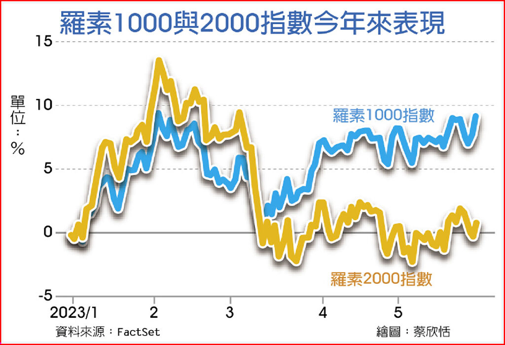 至於小型股部分,受先前美國地區銀行連番倒閉,地區銀行股價慘跌,導致羅素2000指數也受牽連。像是Valley National Bancorp今年股價跌幅達32%,獨立銀行股價更狂瀉46%。