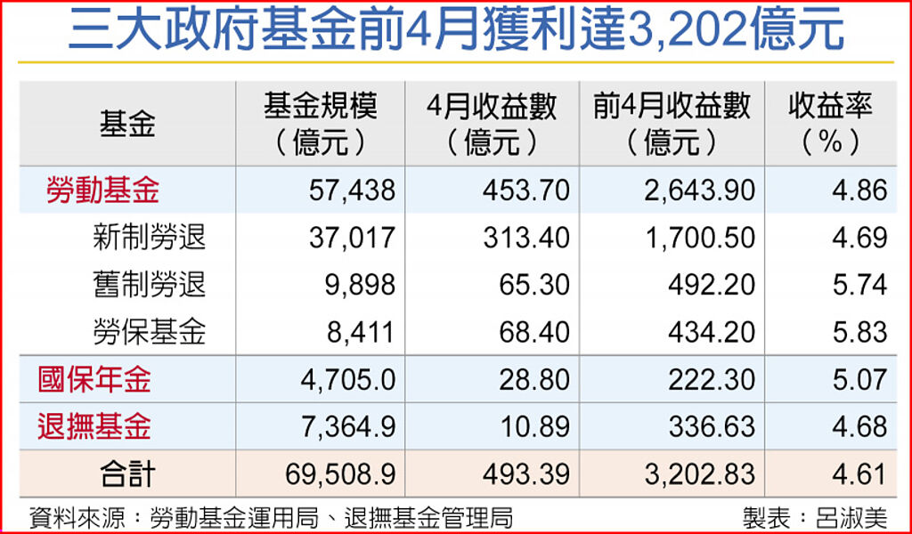 勞動、國保及退撫等三大政府基金4月收益再回升493.39億元,合計前4月收益達3,202.83億元,由於5月輝達AI題材發飆,台美股市大漲,勞動基金運用局副局長劉麗茹估計5月收益「會比4月好一點」。以此推估,前5月收益可望衝破4,000億元。