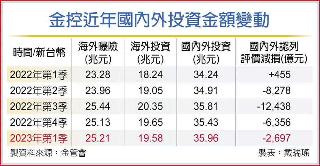 金控投資走出評價減損陰霾。根據金管會最新統計,截至今年第一季底,整體金控在國內、外投資金額高達新台幣35.96兆元、創下史上新高;主要是受惠第一季股匯回穩,金控海內外投資提列評價或減損已明顯縮小58%。此外,加總金控整體海外曝險金額則來到25.21兆元,創下史上次高的曝險部位。