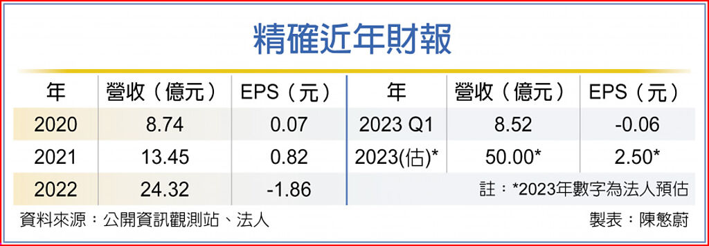 新增訂單效益已反映在精確今年以來營收表現,累計前四月營收11.53億元,較去年同期大增1.35倍。法人依精確在手訂單推估,全年營收將挑戰50億元新高,第二季轉盈後,全年每股純益估達2.5元。