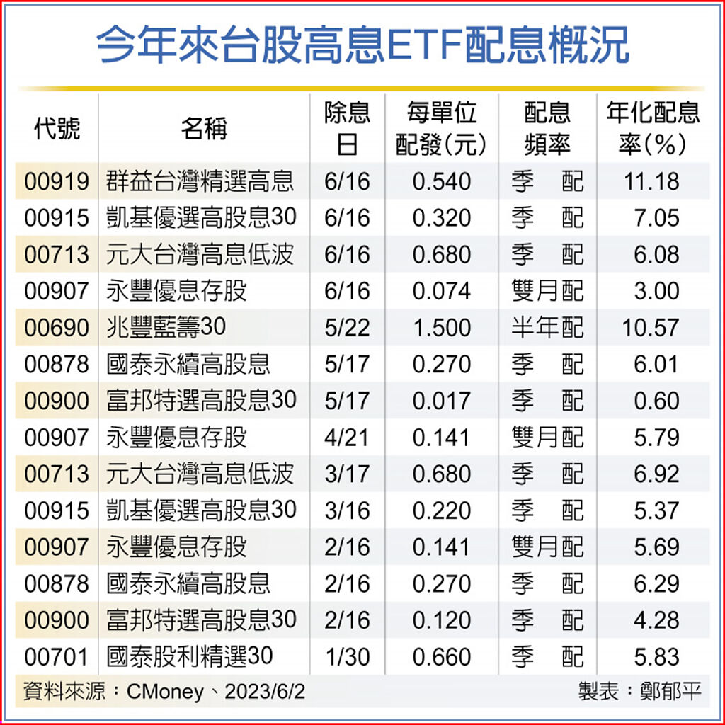 今年台股高息ETF「配息王」出爐!群益台灣精選高息ETF(00919)第一季以15.52%拿下台股高息ETF績效王後,1日公布每受益權單位預估配發0.54元,以6月2日收盤價計算,預估年化配息率高達11.18%,勇奪今年來已公告配息的台股高息ETF配息王。