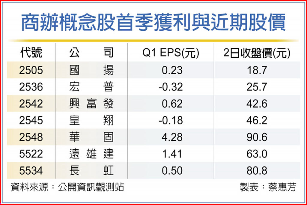 其中包括:國揚(2505)、宏普(2536)、興富發(2542)、皇翔(2545)、華固(2548)、遠雄建(5522)、長虹(5534)等商辦概念股,業績邁向豐收期,今、明年商辦業績貢獻力道可望放大。