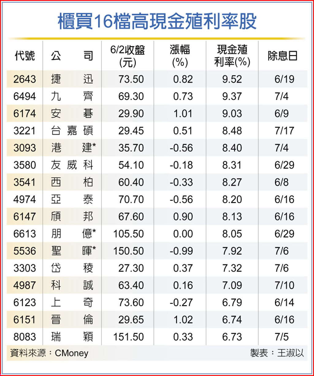 就上櫃股中,即將除息且現金殖利率亮眼個股,高低依序有捷迅9.52%、九齊9.37%、安碁9.03%、台嘉碩8.48%、港建*8.40%、友威科8.31%、西柏8.27%、亞泰8.20%、頎邦8.13%、朋億*8.05%、聖暉*7.92%、岱稜7.32%、科誠7.09%、上奇6.79%、晉倫6.74%、瑞穎6.73%等,投資人可提前卡位。