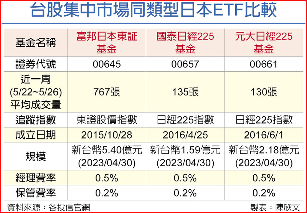 目前市場上日股相關基金商品也不少,楊貽甯建議,日股ETF經理費普遍約僅0.45%~0.5%,相較於日本主動式基金經理費大多介於1.5%~2.0%之間,對投資人更為有利。目前台股市場中的富邦日本ETF(00645)為台灣第一檔日本股票ETF,同時也是台股集中市場規模最大的日股ETF,在日股創新高的帶動下,該ETF交投也日趨熱絡,近一周(5/22~5/26)平均成交量逾700張,遠大於其他日股ETF。