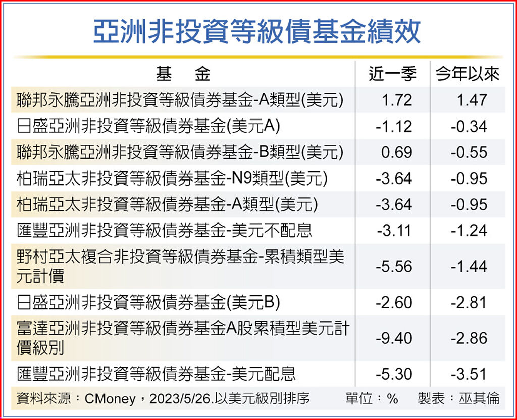 尹晟龢指出,各項數據走緩,美國聯準會(Fed)對於後續升息更謹慎,Fed雖在5月連續第十次升息,將利率升1碼至5%至5.25%之間,創16年來新高,但市場預期Fed最遲在下半年暫停升息,一旦停止升息,將有利債市的反彈,尤其受惠成長動能相對佳、貨幣政策相對寬鬆的亞洲非投資等級債。 |