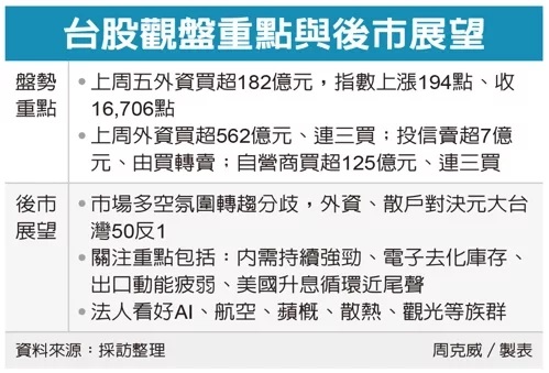 台股近來AI概念題材發酵激勵下一路大漲,統計本波自5月中旬起漲,僅14個交易日,指數大漲1,231點,漲幅8%,雖然各均線呈現多頭排列,有助行情上攻萬七,不過短線技術指標過熱、以及乖離過大的問題,卻也使部分中實戶與散戶開始居高思危。