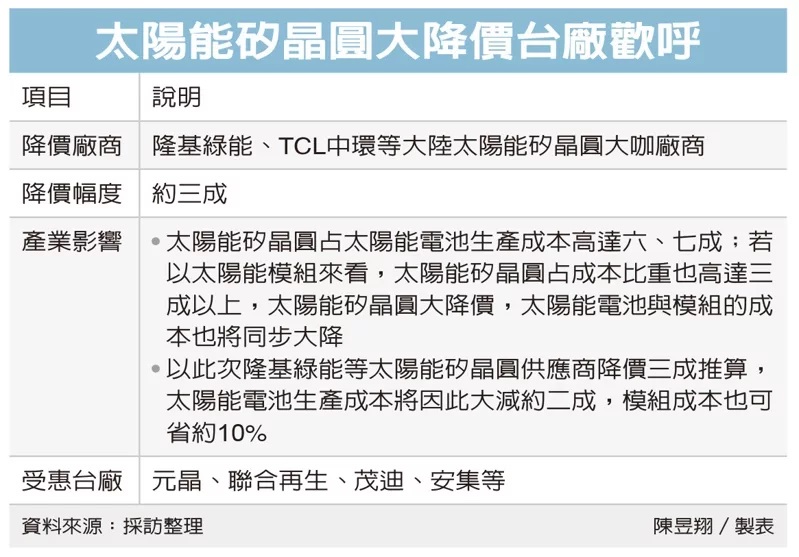 以此次隆基綠能等太陽能矽晶圓供應商降價三成推算,太陽能電池生產成本將因此大減約二成,模組成本也可省約10%,對主攻太陽能電池與模組生產的台灣廠商而言,無疑是一大利多。