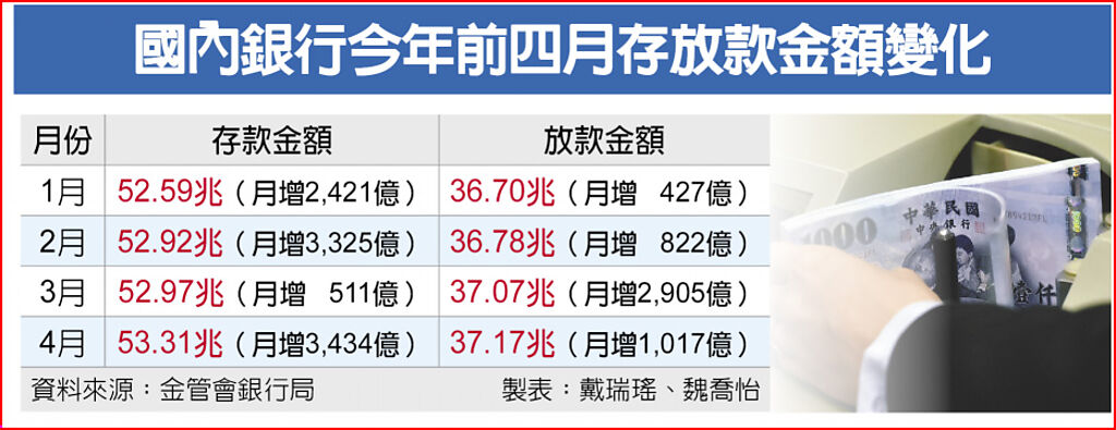 台灣錢潮湧入銀行。銀行局統計,國銀存款前四月增加近兆元,4月底存款餘額突破53兆元、創歷史新高。副局長童政彰8日公布,4月國銀存款增加3,434億元,前4月淨增近9,692億元,也因存款飆太快、放款跟不上,存放比僅69.72%,連四個月不到7成。