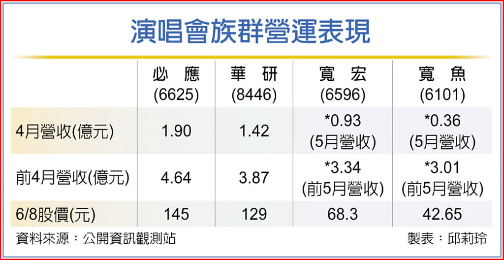 演唱會族群必應、華研等8日連袂攻上漲停,驚艷台股。受惠解封後演唱會、藝文展演快速復甦,國內外展演場次不斷攀升,必應、華研4月營收率先在疫後突破1億元,另寬宏5月營收也逼近億元大關。此外,6月起隨10億文化成年禮金釋出、暑假旺季將至,將有更多有錢有閒的青年、親子進場消費娛樂,好樂迪、錢櫃等KTV個股營運也可望增溫。