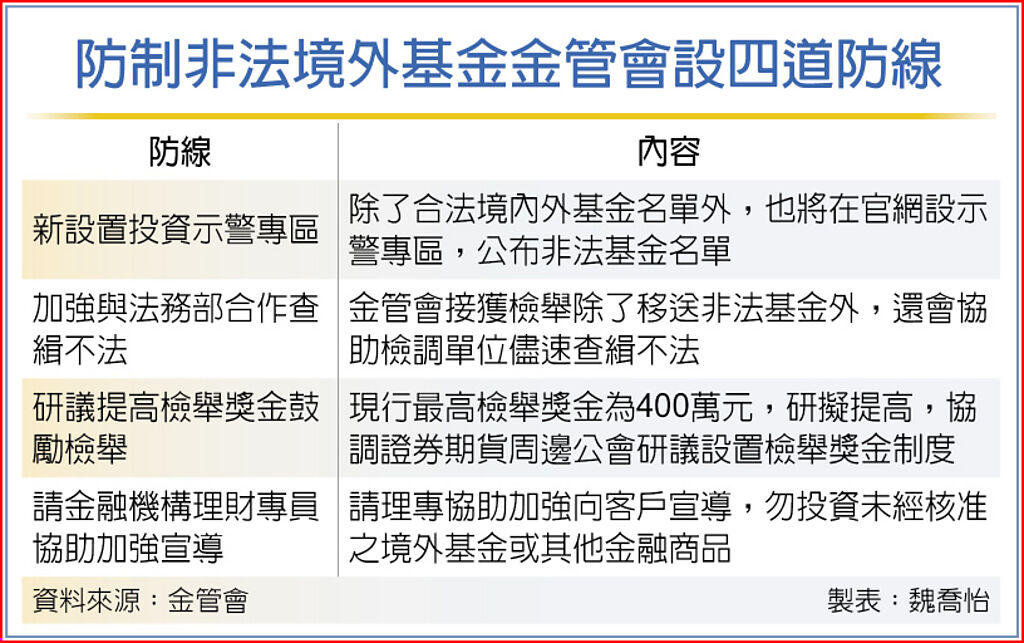 金管會此次祭四大防制非法境外基金措施:第一項:新設置投資示警專區,公布經檢舉查證確屬未經核準基金名單,提醒民眾注意。第二項:加強與法務部合作查緝不法。金管會發現民眾檢舉非法境外基金時,如有具體事證,立即移送法務部調查局偵辦外,將於與法務部工作聯繫會議,共同追蹤移送案件辦理進度。