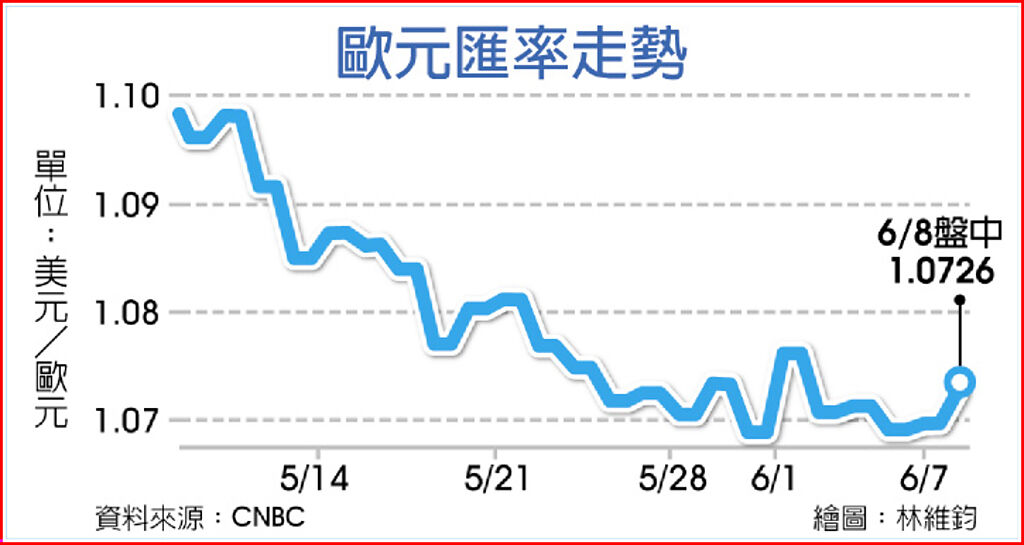 儘管歐盟統計局公布最新報告,將歐元區第一季區內生產毛額(GDP)從季增0.1%下修為季減0.1%,仍未打壓歐元走堅格局,8日歐洲匯市早盤報1.0725美元,上漲0.3%。ING分析師透納(Chris Turner)表示,市場仍預估歐洲央行還會再升息二次,對照美國聯準會升息循環將喊卡,利差優勢站在歐元這一邊。 |