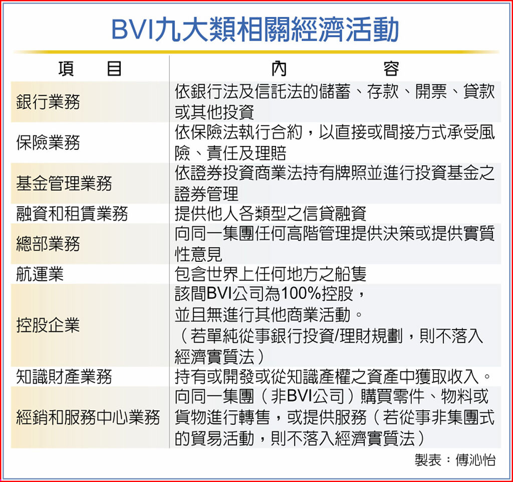 KPMG則表示,從法令最終版本觀察,BVI對於僅作純控股用途的公司進一步放寬申報要求,但又更嚴格要求無形資產公司的申報規範,可見當地政府正加強打擊租稅規避,台商宜提前準備稅務因應之道。