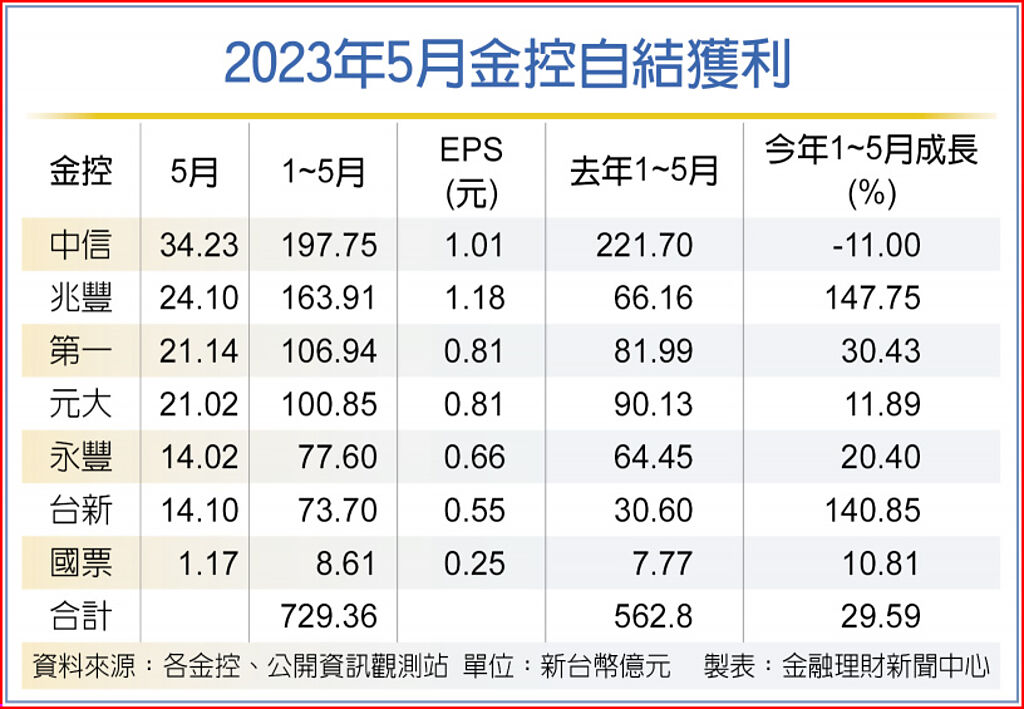 金控前五月獲利陸續出爐,七家金控已公告自結獲利數字,兆豐金、第一金、元大金、中信金等四家累計獲利都突破百億元,七家金控合計稅後獲利逾729億元,年增率29.59%。