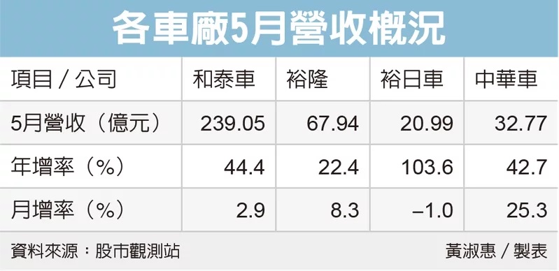 受惠代理TOYOTA及Lexus品牌5月分同步奪下國內豪華車及全部品牌銷售冠軍,和泰車(2207)昨(9)日公布5月營收達239.05億元,年增144.4%,寫下史上第三高新紀錄,也繳出5月同期最好的成績單。