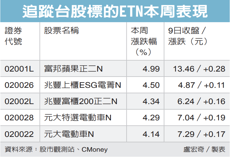 台股本周沿5日線震盪盤堅,距萬七關卡僅一步之遙,追蹤台股標的為主的指數投資證券(ETN)中,槓桿、電動車相關特色在本波多頭走勢中仍居上風,富邦蘋果正二N(02001L)單周漲幅4.99%,拔得頭籌。