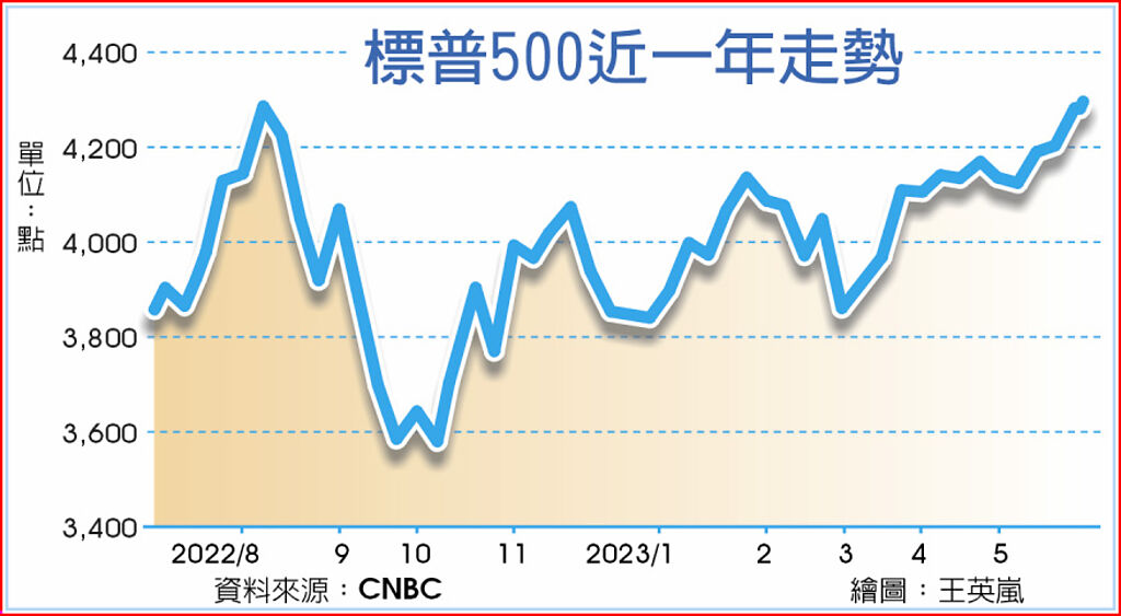 蘋果、超微、輝達等科技股,漲幅介於0.22%和3.2%之間,晶片大廠超微、輝達搭上AI運算熱潮,股價狂飆不止。開盤時漲幅衝破4%的台積電ADR,最後以上漲2.86%的102.8美元作收。道瓊指數收漲0.13%,報33,876.78點。標普500指數則是自去年8月後首度站上4,300點,終場漲0.11%,以4,298.86點作收。那斯達克指數收盤漲0.16%,收在13,259.14點。