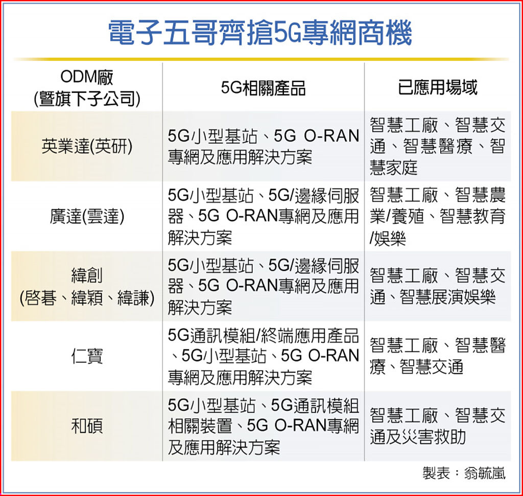 至於緯創,則是與旗下網通廠啟碁、資料中心伺服器廠緯穎合作,除同樣主攻5G相關硬體及元件製造,亦跨入5G開放式無線接取網路架構、網路虛擬化基礎架構等解方。另仁寶則透過與高通和在台產業夥伴合作,協助日月光高雄廠建置全球第一座5G毫米波企業專網智慧工廠。