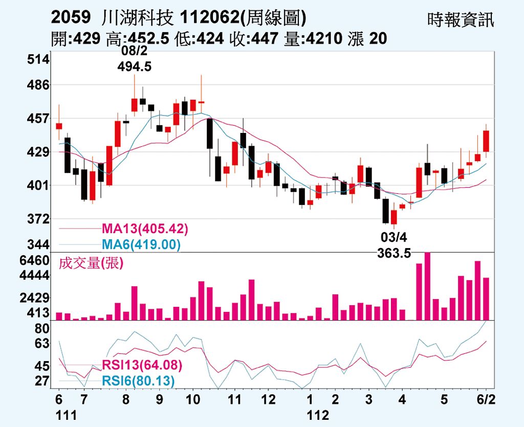 川湖(2059)受惠於近期AI題材火熱,市場聯想伺服器滑軌廠也將雨露均霑,在特定買盤介入之下,川湖股價上周緩步墊高,9日盤中一度創下452.5元本波高點,終場收在447元,漲幅達2.05%,累計川湖單周漲幅逾11%。