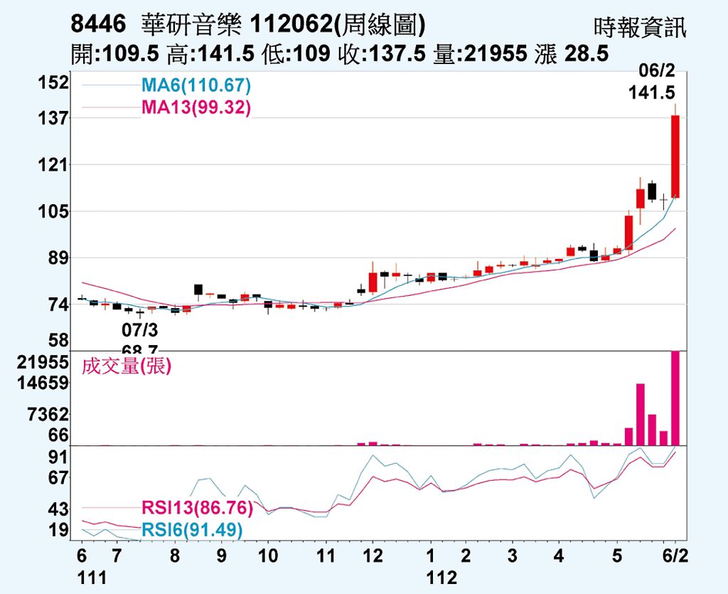 華研(8446)受惠於娛樂商機復甦,9日異軍突起開盤即見漲停,然在獲利了結賣壓湧現後,終場漲幅收斂,以上漲6.58%的137.5元作收,續創波段新高,成交量爆出10,150張大量,惟在連5日上漲下,周漲幅也快速放大,達到25%。