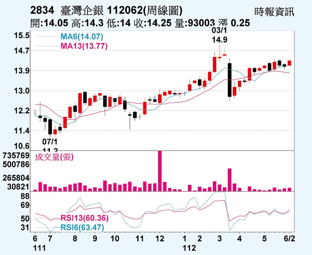 臺企銀(2834)今年前五月稅後純益55.05億元,較去年前五月的32.89億元,成長22.16億元,年增率67.38%。臺企銀前五月每股稅後純益(EPS)為0.69元,每股淨值14.02元。臺企銀分析,受惠存放款業務暢旺及市場升息效益,利息淨收益成長外,同時積極開創多元獲利,使手續費淨收益及金融交易淨收益提升,挹注獲利上揚。