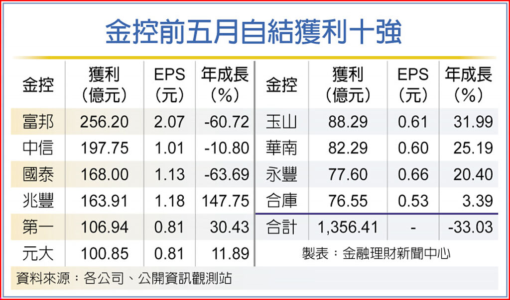 14家金控5月獲利全數出爐,稅後共賺進241.36億元,前五月稅後純益合計達1,356.41億元,較去年同期的2,025.45億元減少33.03%,衰退幅度從年初的6成,縮小至4成以下,獲利漸入佳境。