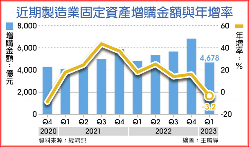 展望未來,經濟部統計處副處長黃偉傑表示,去年寫下高基期,第二季要轉正「很有挑戰」。他也提到,綠能建設持續部署,加上廠商回台投資計畫接續落實,有助挹注我國製造業投資動能,但總體經濟持續受通膨、升息、俄烏戰爭及美中科技戰等變數干擾,加深全球經濟下行風險,仍讓企業資本支出趨向審慎。