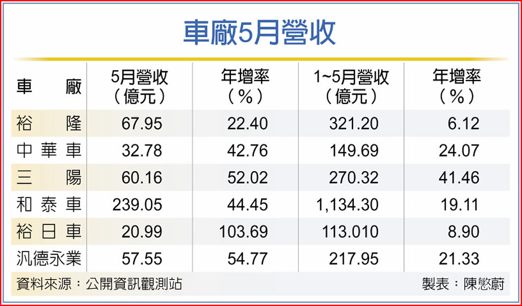 5月車市夯,帶動車廠營收強強滾,繼和泰車、裕日車繳出佳績後,三陽、汎德永業12日公告,5月營收分別創下60.16億、年增52.02%及57.5億、年增54.77%成績,皆改寫單月營收新高紀錄。
