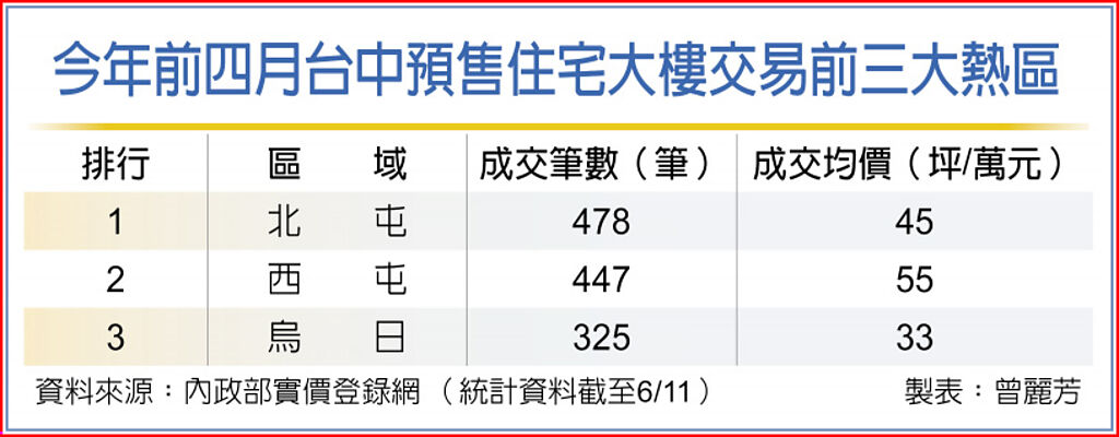 新版「平均地權條例」即將上路,預售市場已提前反映新法效應下的購屋心態。觀察台中前四月的預售住宅大樓交易熱區,分別由北屯、西屯、烏日拿下前三名;在預售屋禁售令逼近下,購屋客勇於進場的交易熱區,突顯出未來性看好,例如烏日區,受惠高鐵娛樂購物城與三鐵共構等利多加持,前四月預售登錄325筆,單日平均成交約2.7戶。