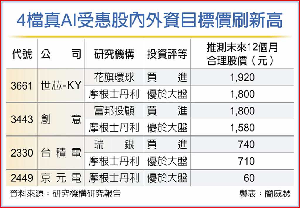 半導體成長重心典範轉移降臨!摩根士丹利證券指出,半導體產業增長動能由行動運算正式進入人工智慧(AI)主導時代,點名台積電、創意、世芯-KY、京元電受惠,確立台積電上看「7」字頭樂觀氛圍;此外,創意、世芯-KY目標價雙雙飆高,市場最高價來到1,800元與1,920元,大有互別苗頭企圖。