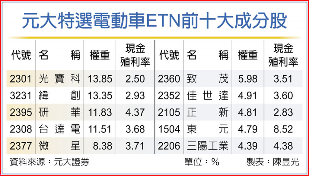 元大證指出,元大特選電動車N是100%追蹤「特選臺灣電動車產業鏈代表報酬指數」(IR0135),篩選台股中的電動車產業供應商,精選符合流動性與市值篩選個股作為成份股。每半年指數公司皆會依據編製篩選規則汰弱留強,到期日為2031年9月26日,超長存續天期讓投資人能隨時搭上電動順風車。