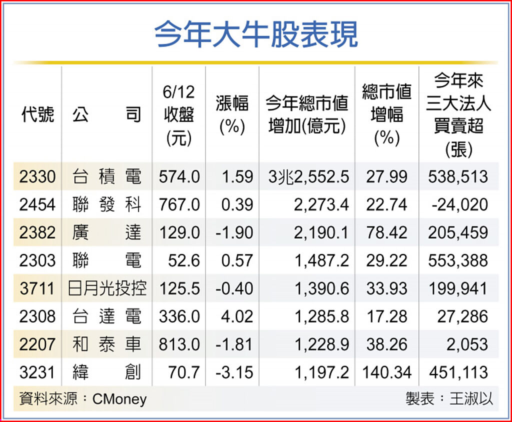 12日台股收高16,955.37點,今年以來大盤指數累計上漲2,817點,護國神山台積電今年貢獻大盤漲點達1,103點,占39.15%,股性牛皮的大牛股如廣達、台達電、和泰車、緯創等今年股價也飛天,搭上AI伺服器的廣達、緯創2檔大牛股狂飆。