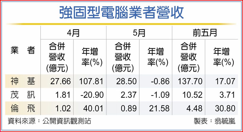 受惠歐美地區持續對軍工規電子產品需求增溫,神基(3005)、茂訊(3213)在旗下強固型電腦產品出貨動能帶動下,5月營收同步較上月增長,今年以來累計營收同步站上歷年同期第三高。