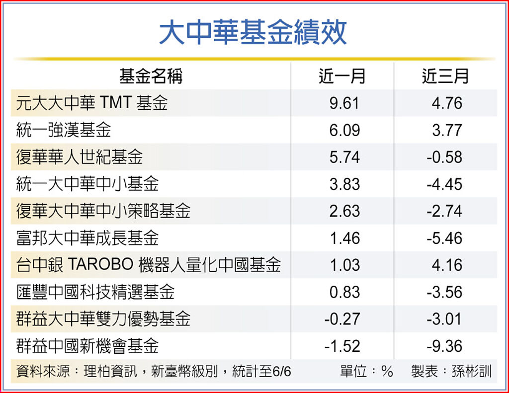 港股6月以來出現積極信號,帶動資金回流,推升恆生及國企股重返月線之上,也激勵部份大中華基金近月報酬率止跌翻揚露曙光。投信法人表示,大陸經濟及企業獲利面正緩步轉向回升軌道,加上海外流動性壓力緩解,目前估值及股價位處低位的港股具投資吸引力,建議逢低分批布局大中華基金,掌握復甦投資契機。