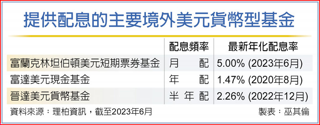 根據理柏統計,台灣核備的美元貨幣型境外基金共有十檔,一部分基金沒有配息,有些則是年配息或半年配息,而富蘭克林坦伯頓美元短期票券基金是唯一採月配息機制的美元貨幣型基金。隨聯準會升息,富蘭克林坦伯頓美元短期票券基金的年化配息率也同步上升,自今年2月起已連五個月高於4%,6月配息率達到5%,相較S&P 500不到2%的股利率、美國10年公債殖利率約3.75%更高。
