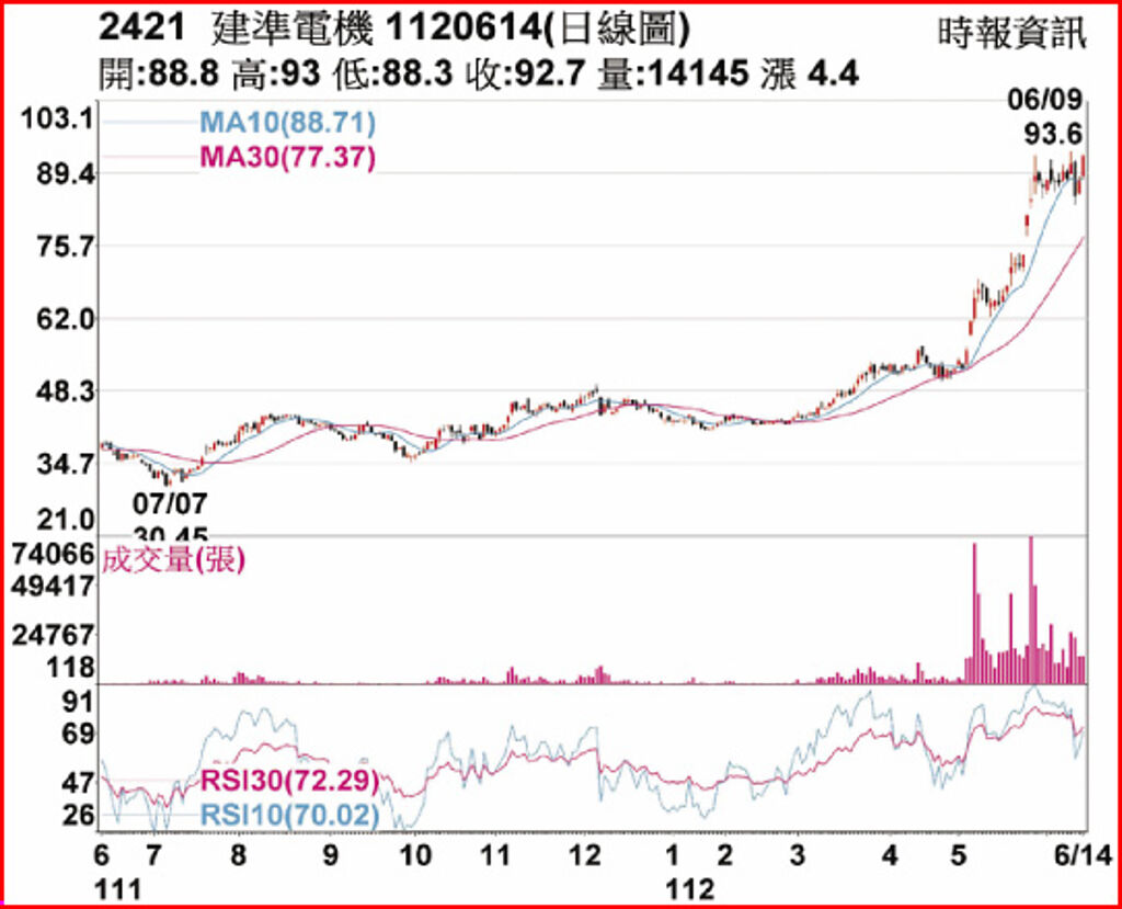 建準(2421)股價因AI伺服器散熱燙金,呈現驚驚漲態勢,近期雖因短線漲多,在高檔呈現橫盤整理態勢,但逢低即見接手,在近二個交易日連拉二根紅棒帶動下,14日收盤價再以92.7元收盤,續創波段新高,單日漲幅達4.98%。